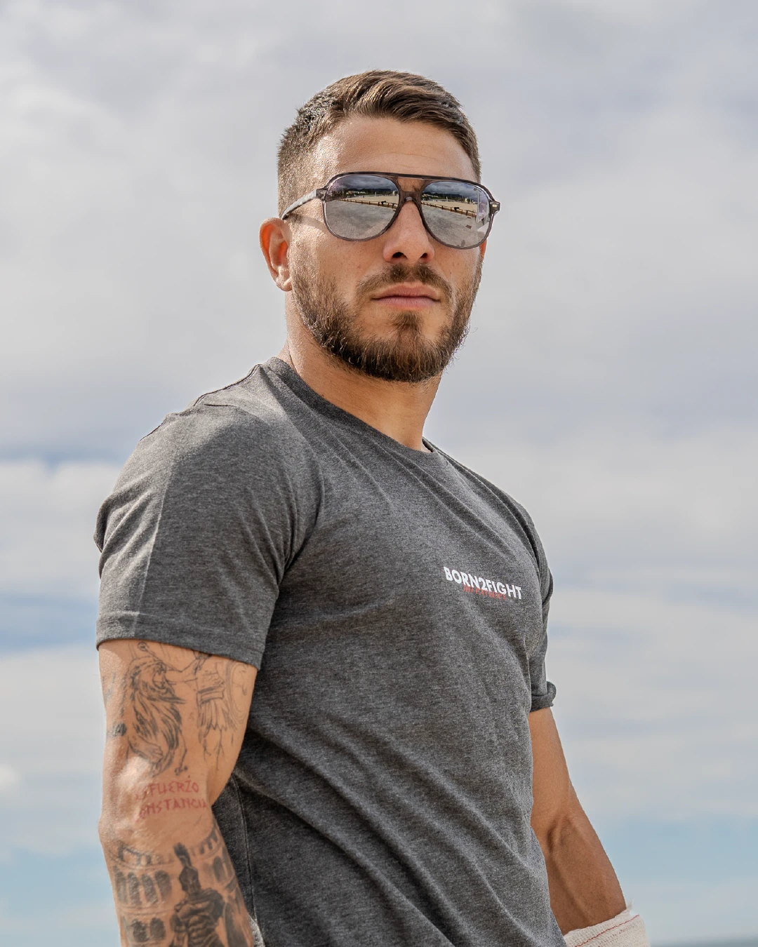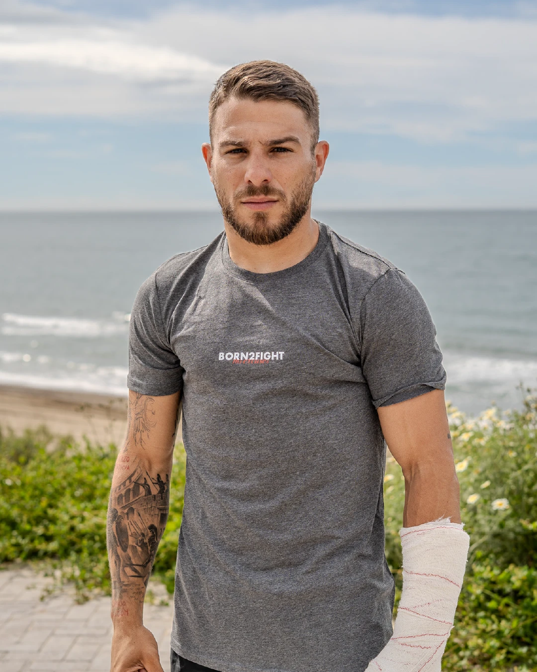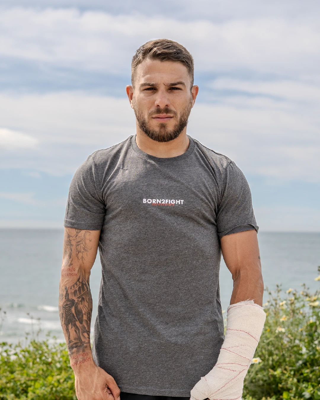 Color gris oscuro, tejido técnico de 65% poliéster y 35% algodón, ideal para darle caña en cada sesión.